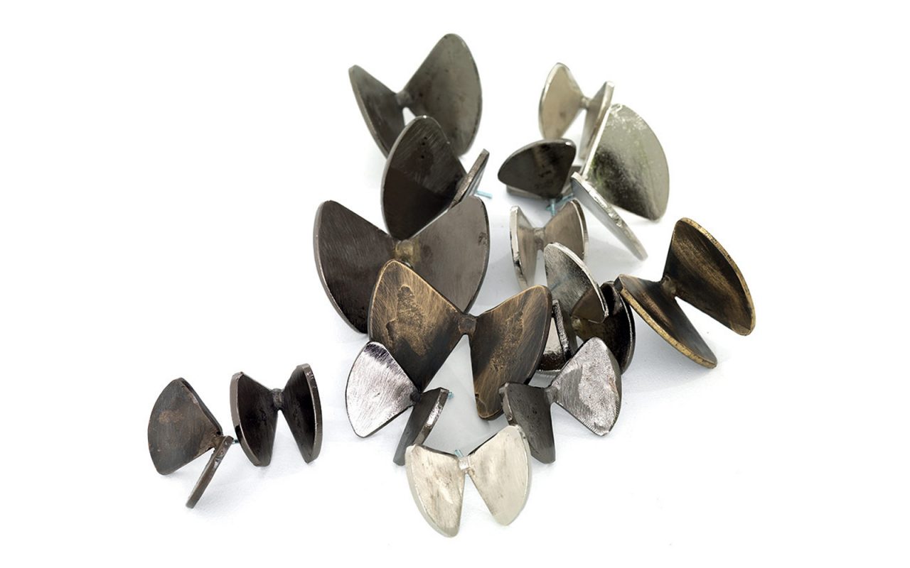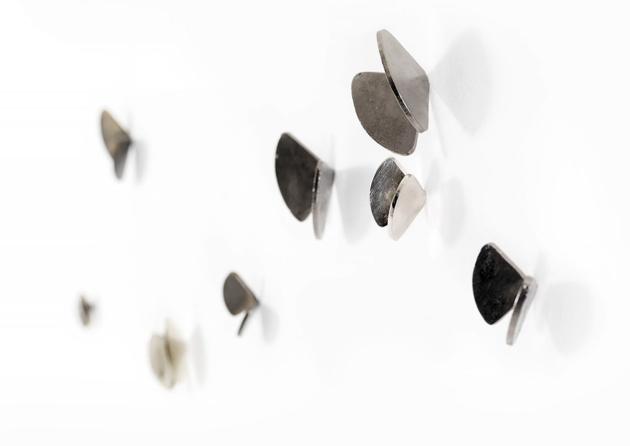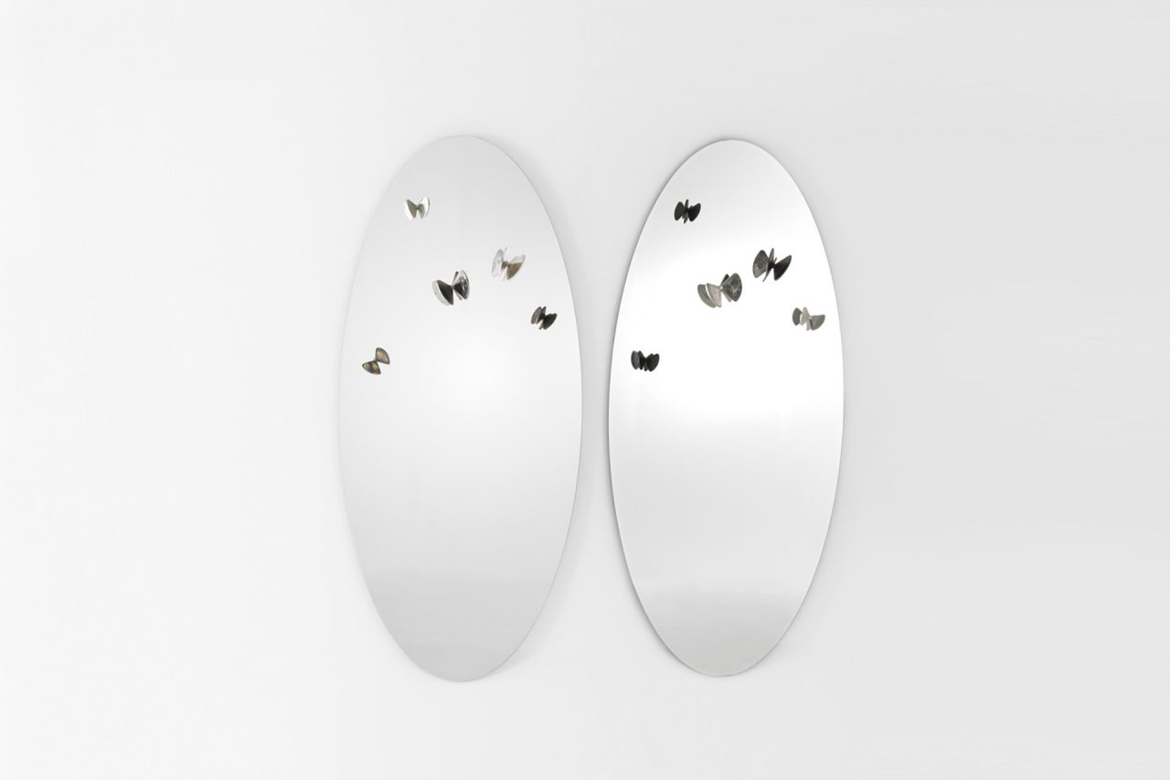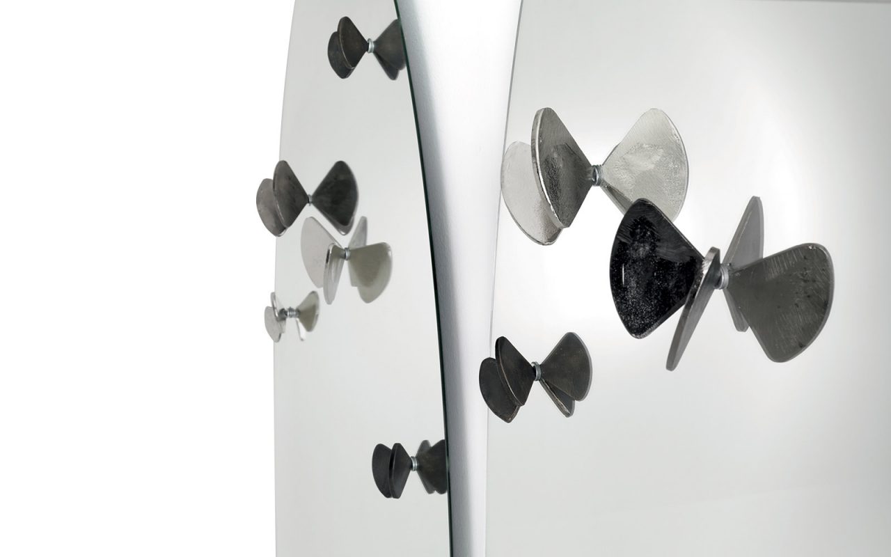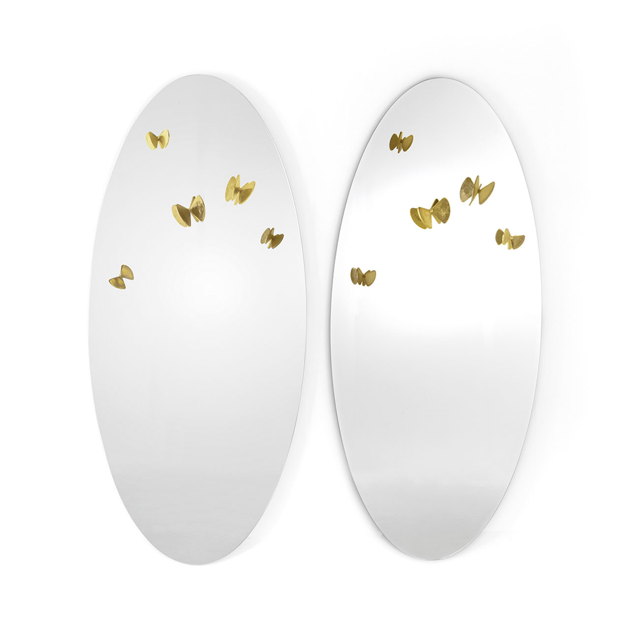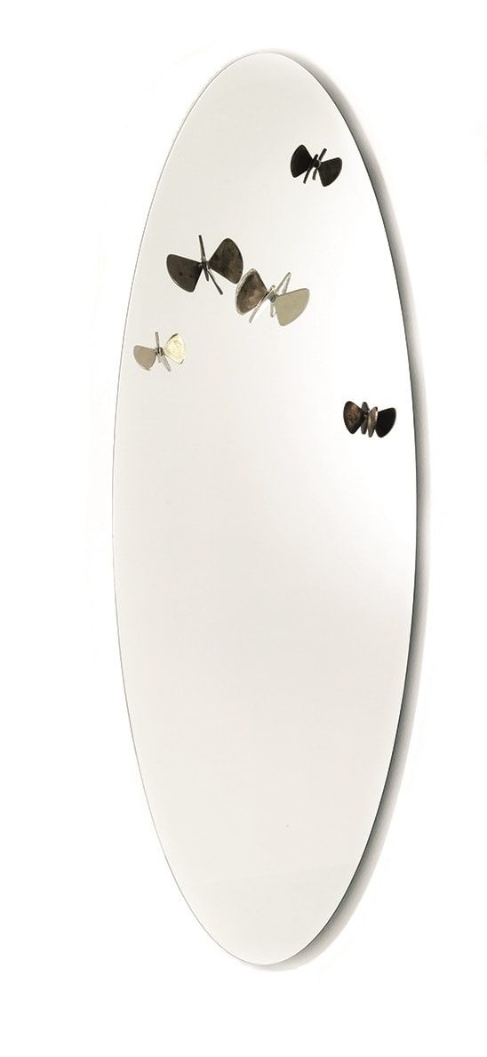 Bice is een ovale spiegel met 5 gestileerde vlinders in 2 maten en verschillende afwerkingen in gegoten messing. Ook verkrijgbaar in een set van 6 kleerhang-vlinders die aan de muur hangen. Kan vrij in de muurruimtes worden bevestigd.