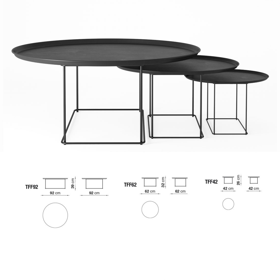 Fat-Fat ontworpen door Patricia Urquiola is een collectie bijzettafels. Er bestaan 4 verschillende groottes. Het frame is verkrijgbaar in glanzend chroom, krijtwit of zwart gelakt stalen profielen. Voor het dienblad kan u kiezen tussen een krijtwit geschilderd, zwart geschilderd of met gepolijst koperen afwerking staalplaat. De dienbladen zijn ook apart verkrijgbaar.