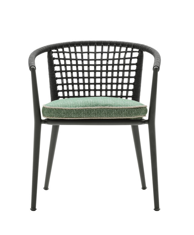 Gebogen en omhullend, de Erica '19 outdoor stoel heeft een polyester gepoedercoat aluminium frame en een rugleuning die wordt gekenmerkt door een exclusieve interliniëring. Verfijnde kleurencombinaties omvatten een enkele kleur of twee kleuren voor het frame en interliniëring. Het zitkussen is verkrijgbaar in een breed scala aan stoffen hoezen. Naast stoelen omvat de Erica ‘19 collectie ook banken en fauteuils.